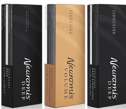 - Neuramis Deep Lidocaine เนื้อเจลหนืดปานกลาง อิ่มฟู มีส่วนผสมของยาชา 0.3% สามารถช่วยลดความเจ็บปวดขณะฉีดได้ เหมาะสำหรับเติมเต็มร่องแก้ม ร่องน้ำหมาก ขมับ แก้มตอบ แก้มส้ม คาง ปาก ใต้ตาชั้นลึก อยู่ได้นาน 6 – 8 เดือน