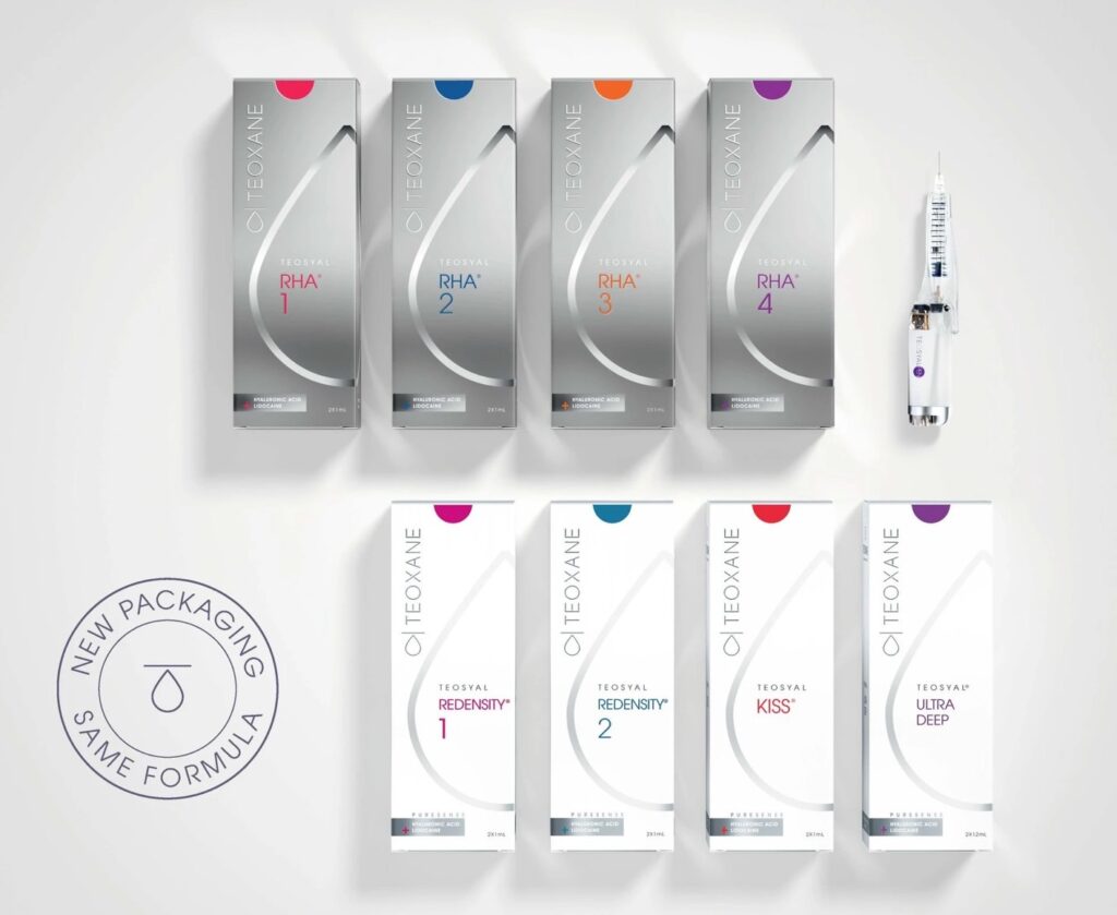 - Teoxane RHA 1 เสริมความชุ่มชื้นและบำรุงผิว ช่วยลดเลือนริ้วรอยเล็ก ๆ (Fine line) บริเวณรอบปาก คอ เนินอก และลดรอยคล้ำใต้ตาเหมาะสำหรับใต้ตาชั้นตื้น อยู่ได้นาน 12 เดือน